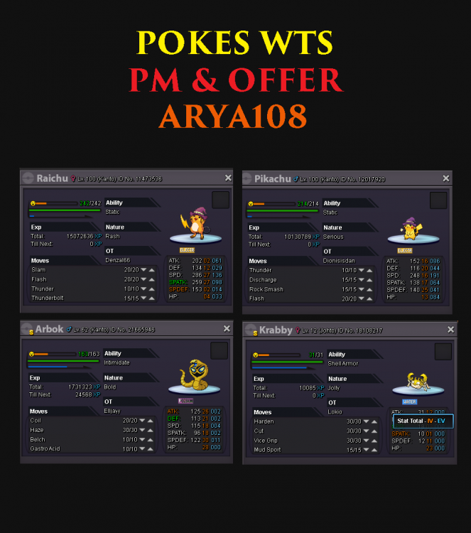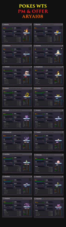 POLSKA Welcome to Arya's Shop in Vermilion! I have some pokes for sell, please PM me on forum or in game if You are interested. Offer only. + wts battle items: black sludge, quick claw, razor claw, focus band, lagging tail, smooth rock. + wts macho brace. + wts black hat. PM me and offer! :) Greetings, Arya108 .