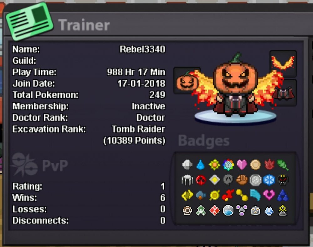 What's your IGN? Rebel3340 Please post a picture of your trainer card! What is your discord ID? rebel3340#0849 How far are you in story? complete all 4 region and almost complete all requirment for legendary quest How active are you in PRO? (How often do you play?) everydays (988 hour and excavation rank : tomb raider, also able to access draconic site can garantee it) Are you a PvP or PvE player? Or do you enjoy both? mostly PvE, still evs poke in my pc and prepare to PvP since i need kyogre surf mount Have you ever been banned in game and why? absolutely no Why do you want to join Calamity guild? i dont wanna lie so i would say i need exp boost and i always feel alone in this game is the second reason