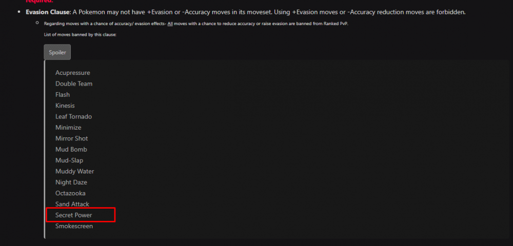 For some reason, secret power was listed as Evasion Clause while this move has nothing to do with evasion This move is totaly allowed on smogon, I dont know if it is bugged in PRO or not but I need further explain for this. https://bulbapedia.bulbagarden.net/wiki/Secret_Power_(move)