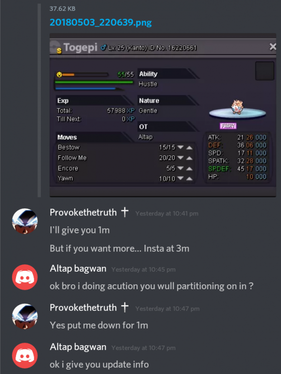 hey bro i want to buy 250k joltik pm my discord name is altap bagwan 8334 pm me bro and my game name is altap