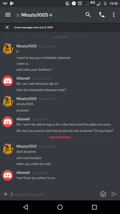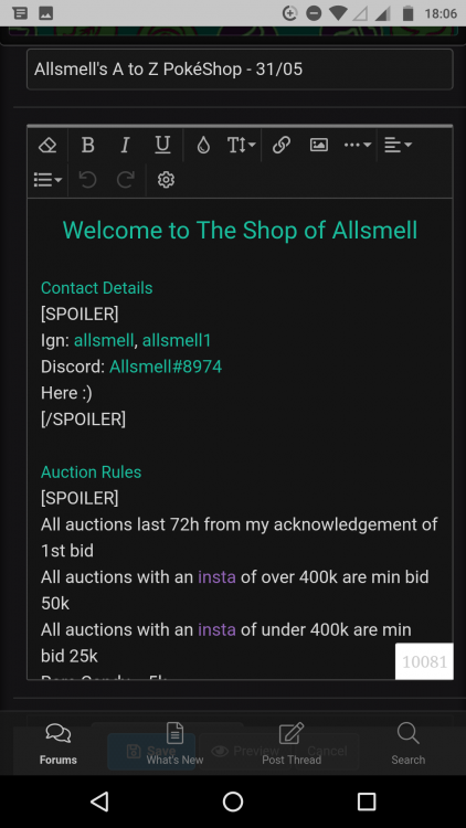 11. @thom37100 I know this is your 1st auction as we spoke ingame prior to this. So before I start the auction I just want to make sure that you realise once you give a bid on a poke, you cannot withdraw your bid. Assuming your happy with this I will start the dolphan at 660k as per your post, with a 3day auction, 50k min bid current Insta of 850k. If I receive no reply here or in-game then the auction will not start