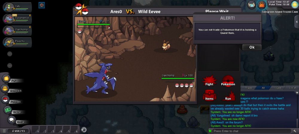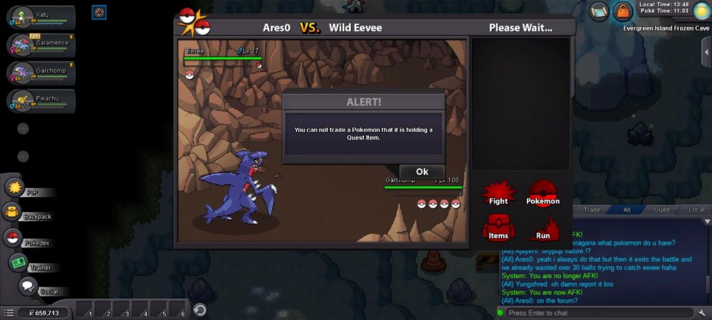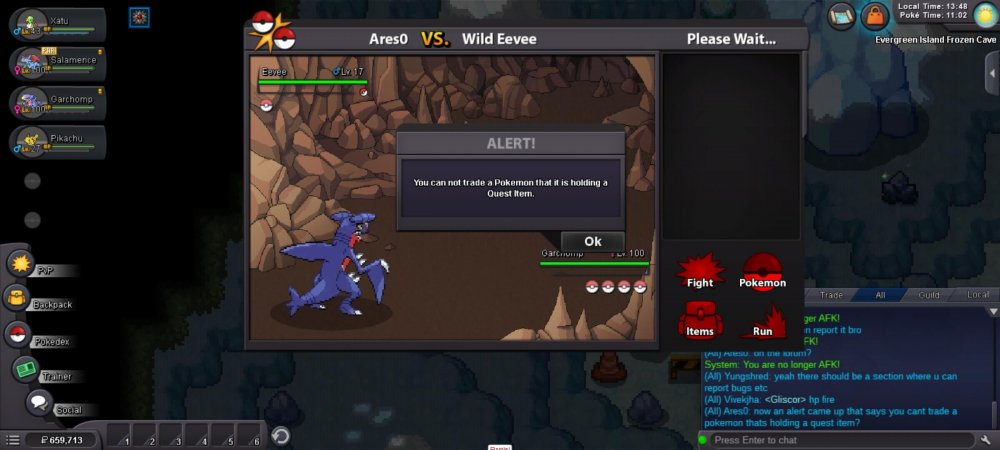 @Contrary it has happened again but this time alot of my items in my bag disappeared then a popup came up saying "you can't trade legendary pokemon" and then a trade window opened while I was in battle with riolu. Again the battle popup froze and again you can see the conversation in the chats still continuing. Please can someone help me with this?