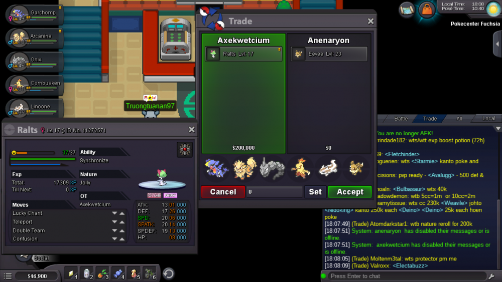 Hi i'm here to offer you a few pokemons at a reasonable price. Before everything else i should start with the rules of this shop: -When offering a for a pokemon, add the ID of the pokemon you want to avoid confusion between 2 pokemons of the same specie. -Every auction ends 24h after the first offer (for a given pokemon). -If the winner of the auction cant buy the pokemon within 2 days it will be sold to the second instead and so on if there are multiple issues. -Minimum offer raise is 10k for every pokemon. LvL 100 trained pokemons starting offer: 190k instant sell: 490k ------ starting offer: 190k instant sell: 490k ------ starting offer: 190k instant sell: 490k ------ starting offer: 110k instant sell: 290k ------ starting offer: 190k instant sell: 490k ------ starting offer: 140k instant sell: 390k Untrained pokes starting offer: 40k instant sell: 130k ------ starting offer: 40k instant sell: 130k ------ starting offer: 40k instant sell: 130k ------