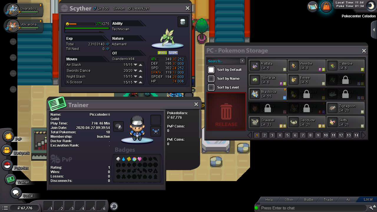 Gold server.I swapped my scyther in my second account, to make it evolve, but scyther is from sinnoh, and my second account is from kanto. My first account is Gianderrick94 andò My secondo account is Piccoloderri, please i need back my pokemon.