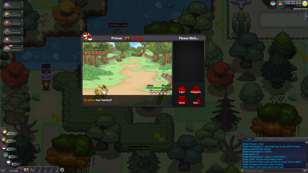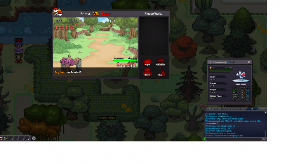 Hello, i would like to report a game bug that has to do with the boss Buggsy. When i used stealth rock on him, getting his scyther out of game (after dragging it out with wirlwind) the bossm buges. All the pokes he had started to look as dead with the message always says scyther has fainted. And then the boss just stuck having me to relog. Tnx for your concern in regards, i also took some screens to make this easy for you. (sorry for my spelling mistakes.)