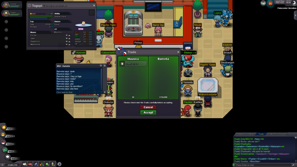 Rules: * I accept coin capsule as 200k and choice items as 150k. Also accepting trade requests. * Any auction will go on for 48 hours since started, unless stated otherwise. * You can give other offers for the fixed price pokes. * Will report fake offers. * You can't cancel an offer once u made one. * Must raise bid on auctions by at least 20k, unless stated otherwise. In game name : Muusica. Discord: Muusica#8018 --------------------------------------------- Auctions: [spoiler=Auctions] Scyther, AUCTION 400k S.O , insta 1.2m. extremely high stats, one of the best tanks with eviolite equipped. Onix, AUCTION 100k S.O , 350k insta. epic adamant onix, 20+ with crazy attack and defense his core stats. Trained Pokes: [spoiler=Trained] Skarmory, 300k Hydreigon, 320k Chansey, 300k, Can solo most bosses by spamming defense curl on a special attacking poke. Talonflame, 250k, high attack and h.a. Machamp, 275k, max attack, good abi. Tangrowth, hp flying 100k Untrained Pokes: [spoiler=Untrained] Riolu, 160k Riolu, 125k Riolu, 100k Phanpy, 60k Deino, 75k Deino, 50k Deino, 40k Chansey, 125k Abra, 150k Durant, 60k Clauncher, 50k Axew, 40k Duskull, 40k Togepi, 60k Girafarig, 50k Wynaut, 130k Gligar, 50k Togepi, 50k Meditite, 55k Meditite, 75k Houndour, 25k Pineco, 40k Murkrow, 40k Seedot, 60k Seedot, 30k Snorunt, 30k