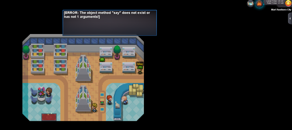 I entered the pokemon mart in Rustboro City in Hoenn to buy some pokeballs, when i spoke to the shopkeeper he just said. " [ERROR: The object method "say" does not exist or had not 1 argument!] " After that nothing happened.