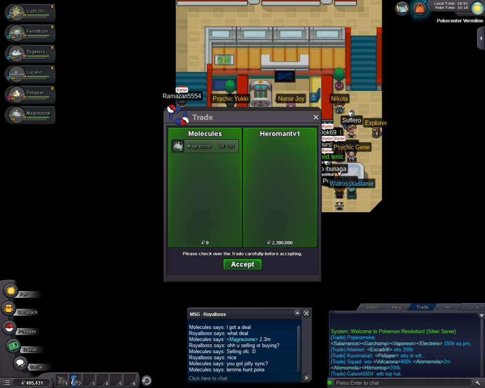 #1 Lucario - 1.4m - w/out item #2 Ferrothorn - 1.9m - w/out item #3 Forretress - 1.8m - w/out item #4 Scizor - 600k - w/out item LEAVE DISCORD NAME!