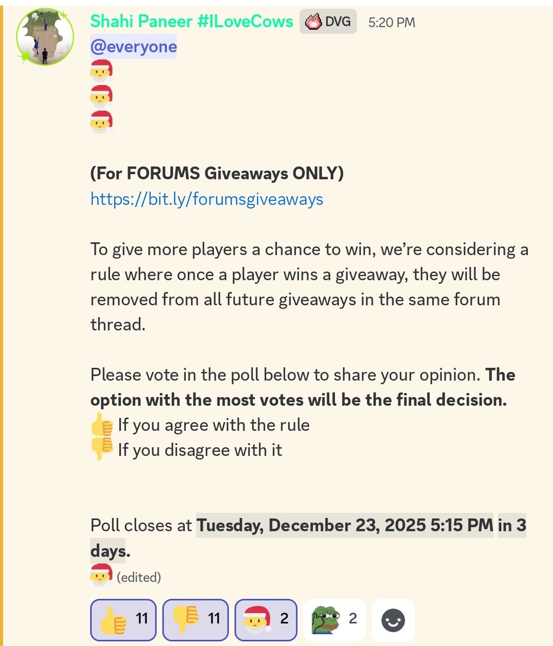 (NEW) Update — 1 20 Dec 7:34PM Ho ho ho, everyone! The holiday season is here, and Dark Vengeance is spreading some festive cheer with a Christmas Special Giveaway Event! This event is our way of giving back to the entire community and celebrating Christmas together with generosity, fun, and surprises. Don’t miss out—join the giveaways, spread the holiday cheer, and celebrate Christmas with DarkVengeance! Event Details: We’re hosting 25 special giveaways, packed with festive surprises and amazing rewards. Why 25 Giveaways? Because Christmas falls on the 25th, we’re going all out and hosting 25 separate giveaways, each packed with exciting and festive rewards! Every giveaway is a chance to win something special. Winners will be picked using a random name picker on 25th December. To be live-streamed. Make sure to Join Our discord server for updates and additional giveaways. (https://discord.gg/AbVF96eEbG). How to Participate? Reply with your IGN and Server in this thread below. Once you reply, you enter into all 25 giveaways! Entries will close strictly on 25th December 12:00PM IST. Rules: This Event is open for Both Servers. Live Stream is tentatively scheduled for 2PM sameday. Each Giveaway will have 1 Winner. If a banned player wins, their reward will be re-rolled. One entry per person – multiple entries or duplicate accounts will be disqualified. Be respectful – no spamming, bullying, or inappropriate content. No changes to rewards – if you win a mount of your choice, it cannot be exchanged or swapped, even for something of equal value. Rewards can be seen below and Pokemons can be seen in Spoiler next to it. Giveaway and Rewards: Giveaway Number Item/Pokemon Winner Remarks 1 Exp Boost 2. 50 PP Ups 3. Galvantula 4. Lunch Box 5. 100 Focus Sashes 6. Umbreon 7. BMS 8. 2 Master Balls 9. 251225 10. Set of Choice Items 11. 100 PP UPs 12. Heavy-Duty Boots 13. Xatu 14. 69 Rare Candies 15. Set of Assault Vest and Rocky Helmet 16. Impish Altaria 17. Your Choice Land Mount (50C) 18. Your Choice Surf Mount (50C) 19. 2 Master Balls 20. Dc Clothes 21. Nature Reroll Ticket 22. Chansey 23. Nature Reroll Ticket 24. Coin Capsule 25. Reroll Ticket Good luck to everyone, and let’s spread the Christmas cheer together!