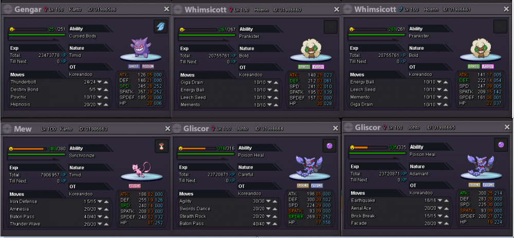 I think most of you know that infamous 6 Poke vs 48 Ultimate Boss Team by FatManCLT and some people used it probably too. I used it for about a couple of months and had a pretty solid winrate but I wasn't quite satisfied with the outcome after some bosses got reworked. So one day I was farming hidden ability Gligars and got an epic "Sync fail" adamant Gligar and thought, man this pokemon could be a nice Sweeper. So I hopped on Pokewiki and checked some possibilitys to set up a Team around Gliscor to make a faster more reliable boss team. First of all I want to thank FatManCLT for his idea I really like it and the basic framework of the team still overlaps with his team. Some things that bugs me as I was using this team was the long Setup (32-33 turns), because of the long set up's crit or status hax chance was pretty high and if you debuffed your enemies Pokemon and it holds a lifeorb it faints itself and you are facing a much stronger pokemon, Ghost Pokemon were a big problem too as Shadow Ball drops your spdef sometimes, Pokemon with Sturdy or a Focus Sash could land a hit or make some status move. Some bosses were pretty shaky only one crit could take you out like the Wash Rotom of lt. Surge. I wanted to boost faster against certain attacks while Stockpile boosts each defensive stat I personally prefer to boost two stages in one turn against the pokemon I'm facing. Mew has way better defensive stats so even if you get freezed it can easily tank many hits. I made a little PDF for y'all explaining my Team idea and doing some comparisons, you'll find the the PDF in the attached files. The PDF contains every information you need but I will drop some important things here in the Post so you don't have to open the PDF everytime. [spoiler=Team] Gengar and the two Whimsicott's are pretty easy to farm so it won't take long. If you don't know how to get Mew here is the Guide (Guide) As you can see my Mew is really terrible so it doesn't matter how good your mew is just ev train it and it hase enough bulk. Remember the requirements for Mew are lowered I think you only need about 100 or 125h to get it. If you want to use Mew as BCC False Swiper you can drop for example Amnesia it only costs 2k at move relearner you only need this every 12 days anyways. Like a said above I was farming careful Gligars which is a quite useful pokemon pvp and pve. If you decide to farm some careful one you can use one of the medicore ones as Buffer pretty easily. For the Sweeper i'm pretty sure you don't need an epic one, any decent Gliscor will be enough. Speed doesn't matter, you buff your speed 6 stages so even one speed is good enough. I investet some EV's in spdef only for some ice attacks like Blizzard and Ice Beam. I personally prefer Brick Break over Poison Jab because it kills chansey's one hit and if I face a Skarmory or a Aerodactyl I only have not effective moves with Facade and Aerial Ace, Earthquake and Poison Jab has no effect, Brick Break hits at least neutral and Poison Jab only hit's slightly harder than a STAB EQ if you use it against Fairys. You could run Ice Fang for a bit more coverage but it has a 5% chance to miss so I decided to use Brick Break. [spoiler=which lead, what buff and attacks Google Spreadsheet] I made a small Spreadsheet for people using the Team the first time, explaining which lead I recommend and what to buff first with Mew, almost every buff is clear but there are some mixed Attacker like Lucario and Groudon so this could be helpful for you. I included the attacks I'm using with Gliscor to have the best and fastest outcome. Spreadsheet [spoiler=Sample Video against Lance] I made a short Video to show you how to use the Team. You need about 3 minutes for every Boss except two or three Bosses, Letrix and Naero finch hax you sometimes and Brock's Aerodactyl will taunt you sometimes. I use this team since November and have really fast and consistent rounds I'm really happy with the outcome. If you have any questions feel free to ask. Greetings Koreandoo Bosseteam 2.0_english.pdf
