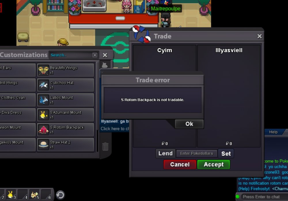 please this is very strange there is no notification that the bag rotom coin capsul is prohibited from trading .... i want to sell orders from people backack but it can't be traded ...