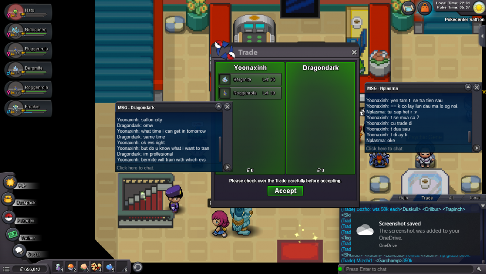 2. My name is nana , i'm from Vietnam , i play in Silver Server My ID ingame is : Yoonaxinh ID of Scammer : Dragondark i buy a train EVS service from Dragondark , i take a picture when we trade . On the left is the messenger between me and him ( Dragondark) , on the right is the mesenger between me and my friend (Nplasma) he advise me to report him , the day is 26/3/2020 and he say 27/3 he will back pokemon to me , but now 28/3/2020 i remember and check my Friendlist ( Social ) and don't see his account , he remove friend,i know he scam me , now i'm very very boring because this is 2 pokemon ( Bergmite i catch in route 216 sinnoh and Roggenrola i catch in Mt Coronet 5F both are catched by me ) which i really really like and it took me 2 days stay up late , i really need it , Mod and anyone can help me and can i receive my favourite pokemon :(( Now i'm so boring and worry about my pokemon i wonder can i receive it . i'm in vietnam so i'm not good in english thanks mod and everyone