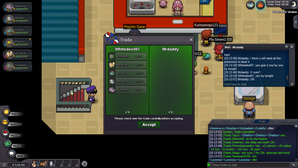 USERNAME:Mrdaddy POKEMONS GIVEN:1.Arcanine 2.Umbreon 3.Rhydon 4.Ivysaur 5.Nidoking These pokemons were give to the player and he didnt return the poke when asked in the message to "show poke" he didnt reply to the message ,Therefore i ask you to return me the pokemons immedeatly .Ill attach proof in the next message