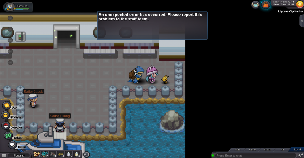 1. Update: Fixed by itself after 15 minutes. ty Hi staff. Today i did the little quest to can go to sinnoh (galactics grunts, pluton battle and all that things) and when i finally finished and just need to talk with alakazam in lilicove city the NPC tell me "An unecpected error has occurred. Please report this to the staff team.