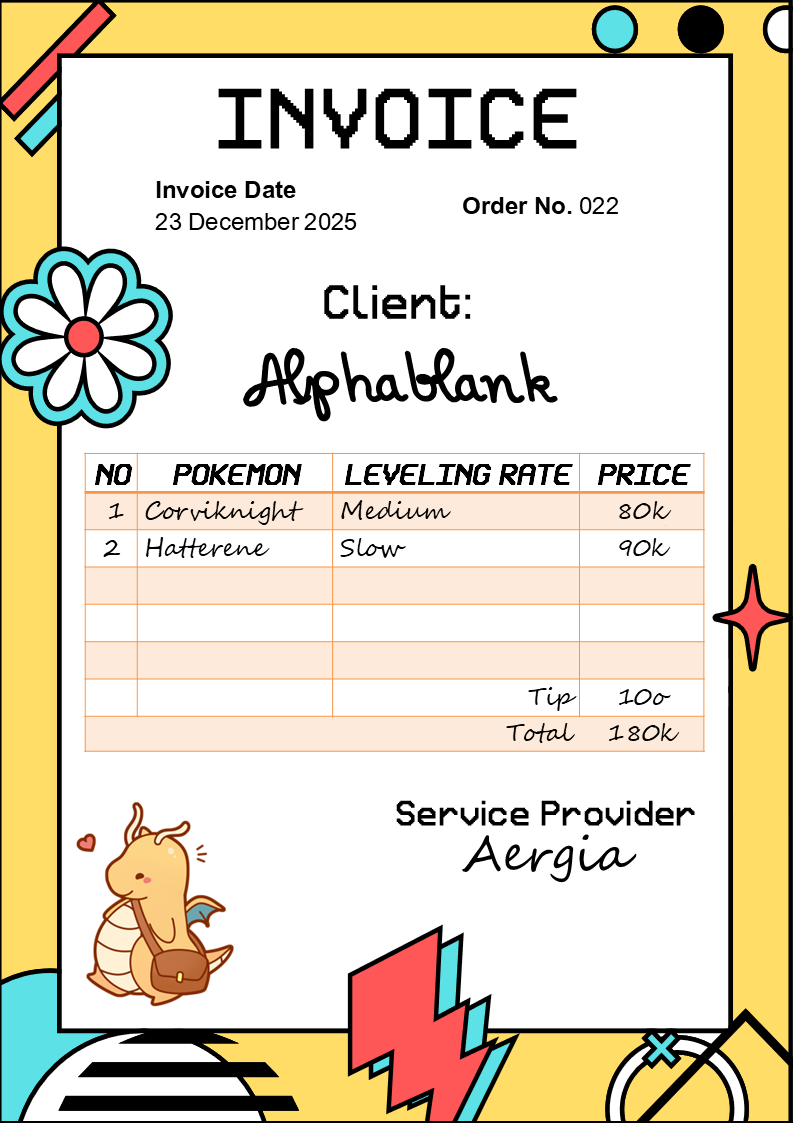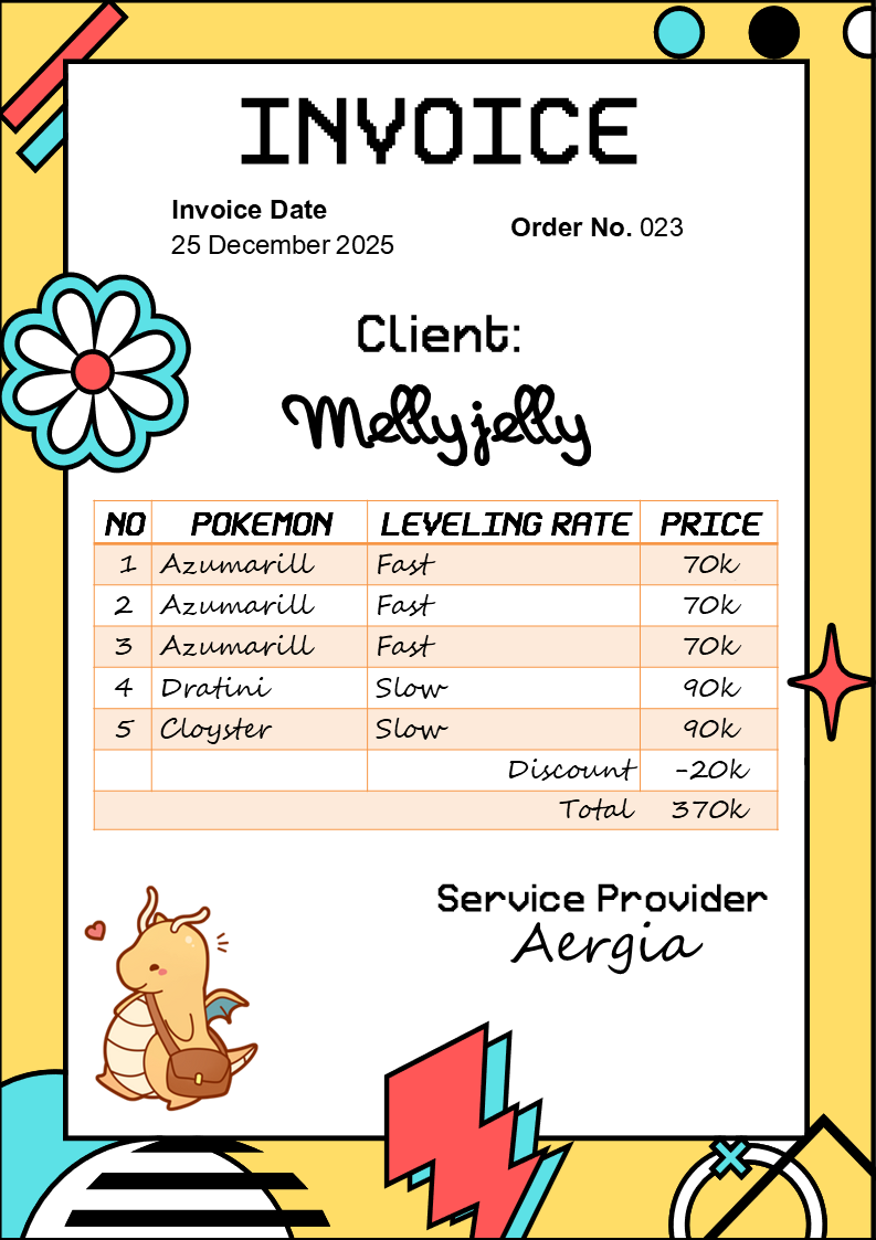 WELLCOME TO MY SERVICE SHOP Price The price dependent on Pokemon's base EXP. You can check it on Bulbapedia. For example Special Discounts & Promotions On special occasions or entirely at random, we love sending our loyal customers large and unexpected discount codes. These may be based on holidays, your order number in the queue, or simply because we want to send you a gift. Stick with us long-term, and who knows, you might be the next lucky trainer! ^_^ ️FAST CONTACT Ingame: Aergia Discord: LeVi#7622 Forum: Write a reply in this thread or send a PM to this forum account A Quick Note on Service Speed In real life, I work as a teacher. Therefore, I may sometimes be quite busy with work and unable to complete orders quickly. Please let me know your desired deadline when placing an order. If I cannot meet that timeline, I will either offer you an additional discount or, reluctantly, have to decline the service. I appreciate your understanding and patience. Training Queue MISSION COMPLETED Thanks for stopping by.