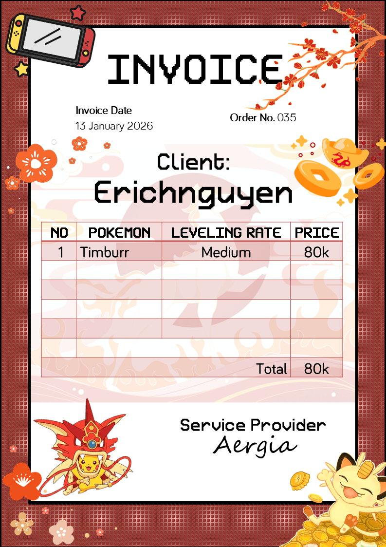 WELLCOME TO MY SERVICE SHOP Price The price dependent on Pokemon's base EXP. You can check it on Bulbapedia. For example Special Discounts & Promotions On special occasions or entirely at random, we love sending our loyal customers large and unexpected discount codes. These may be based on holidays, your order number in the queue, or simply because we want to send you a gift. Stick with us long-term, and who knows, you might be the next lucky trainer! ^_^ ️FAST CONTACT Ingame: Aergia Discord: LeVi#7622 Forum: Write a reply in this thread or send a PM to this forum account A Quick Note on Service Speed In real life, I work as a teacher. Therefore, I may sometimes be quite busy with work and unable to complete orders quickly. Please let me know your desired deadline when placing an order. If I cannot meet that timeline, I will either offer you an additional discount or, reluctantly, have to decline the service. I appreciate your understanding and patience. Training Queue MISSION COMPLETED Suprise Promotion Thanks for stopping by.
