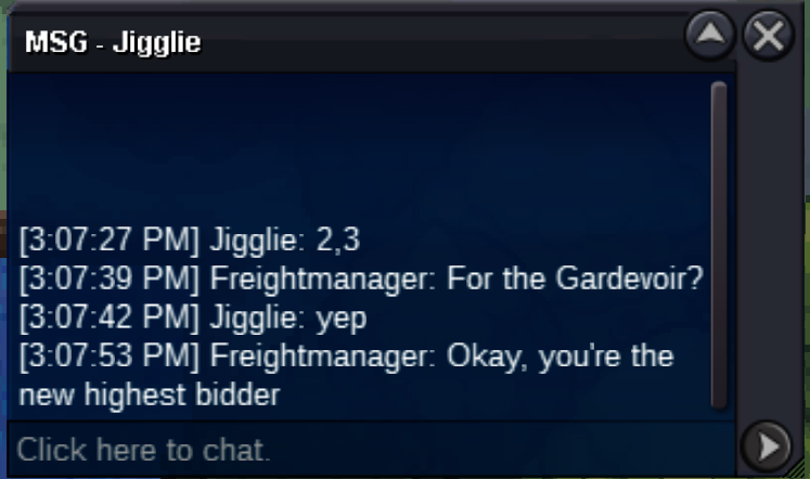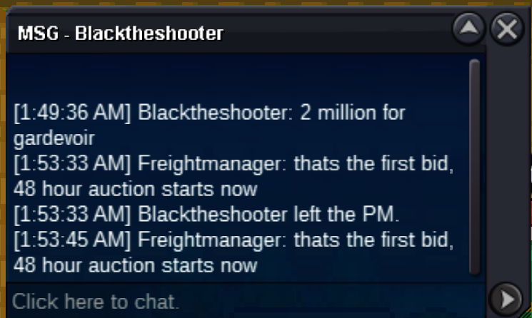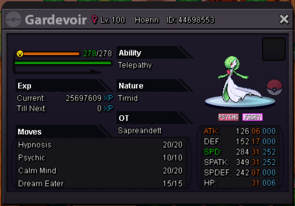 1. Due to fake bids, I have received permission from the trade moderators to restart the auction. Hello everyone! I have an absolute beast of a Gardevoir for sale. See details below regarding the auction. Starting bid: 2 million poke dollars Length of auction: 24 hours Start time: Once first bid comes in Ending time: 24 hours after first bid Buyout Price: 4 million poke dollars Minimum bidding increments: 100k poke dollars Additional details: If a bid is placed within the final 15 minutes, an additional 15 minutes will be added onto the ending time. Contact info IGN: Freightmanager Discord: xQDD#9080 Have fun and may the best bidder win!