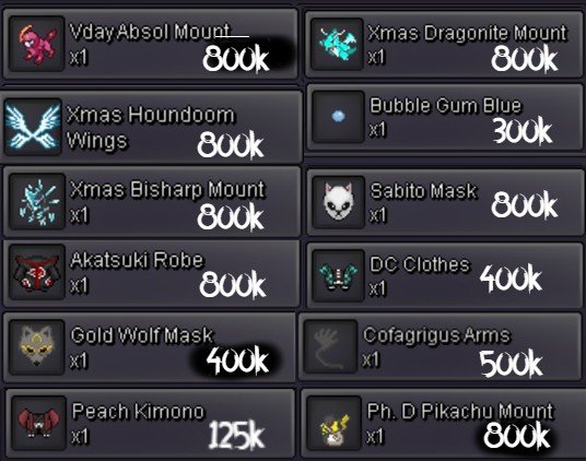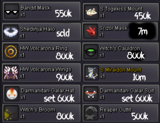 SOLD OUT ITEMS: HW BISHARP SET, BLINDFOLD, POIPOLE MOUNT , XMAS SCEPTILE MOUNT, XMAS CHARIZARD MOUNT, HOLLOW MASK, VDAY RAICHU WINGS, EASTER ROTOM EARS, ANGEL EARS, MINI MERRY II, OGERPON HF SET, VDAY SWAMPERT MOUNT, XMAS HYDREIGON MOUNT, DEVIL EARS, BLACK BANDANA, S AEGISLASH, S MUNCHLAX HAT, S GARDEVOIR MOUNT, S DRAGONAIR MOUNT, S FENNEKIN EARS, VDAY NINETALES WINGS, L SET, XMAS SERPERIOR MOUNT, SHISUI SUSANOO(GREEN), BLUE WOLF MASK