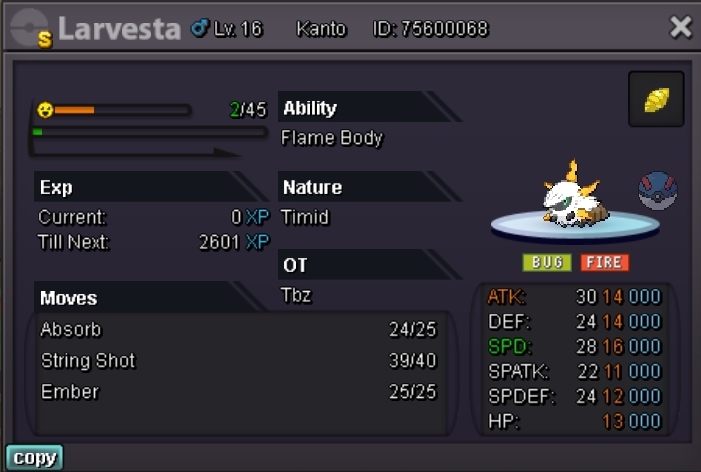 FRESH SHINY LARVESTA, I AM OT Ability: Flame Body Nature: Timid HP: Rock Auction will end @ 7:13pm Saturday, CST Starting offer: 10m Minimum raise: 500k NO INSTA GL ALL