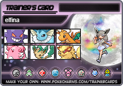 My name is Elfina, my favourite pokemon happens to be EEVEE! lol ^_^; I am truly enjoying the game, even though I just started it. Much appreciated to the developers, will be donating a little bit before Christmas! Thank you all so much for having me and I hope to make some friends!