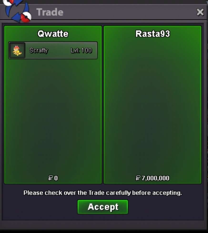 Auction Details: Start Price: 10k End Point: 30 minutes (after start price is met) Insta Price: N/A Minimum Raise: 10k Accepted Payments: Pokedollars Important Reminders: This is a Gold Server auction. If bidding from an alternative server, state that you will transfer upon winning. If you intend to purchase with an alt account, specify the account alongside your bid. If a bid is received in the final 15 minutes of the auction, the end point will be delayed by 15 minutes from that bid, and will be delayed by 15 minutes for each new bid thereafter, until the current offer has been held for a full 15 minutes. Happy Bidding!