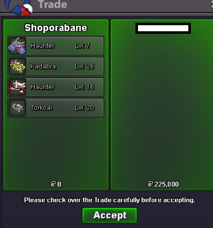 IF A TRADE MODERATOR HAVE TO FORCE A TRADE , ALL POKEMON WAS ON SHOPORABANE ACCOUNT Total Pokemon for sale : 46 Total Pokemon sold : 26 What you need to know Pokemon Shop Rules - Cross Server only if u come on SILVER. - Fake offers --> Instantly Reported. - No auction here. - First buyer who confirms the purchase will have the pokemon, even if someone intends to buy it more expensive. - Purchase can mixing Item and money, do the difference. - Only accept items on list Payment available - Capsule coin : 480.000$ each - Nature Reroll Ticket :340.000$ each - Iv's Reroll Ticket : 680.000$ each - Pokedollars - Rare candy : 6.000$ each - PP Up : 2.000$ each - PP Max : 6.000$ each Contact me here first if im not Ingame My information ingame Step 1 - PM this account ingame Step 2 - Join my storage account in Vermilion City Step 3 - Let's Trade Pokemon Shop Form Pokemon Lv.100 Form Event Pink - Untrained Trade Complete(11)
