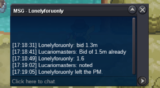 The Auction has ended. The winner is: @Zeroeevee Congratulations! The price ended at 4m. I live in Sweden which is Gmt+2 for your information. i will be gone for an hour and half to pick up my sister from work. You can reach out to me here, on discord or in game for trade. Ingame: Lucariomasters Discord: Sebbeebbes Thanks for bidding! ^^