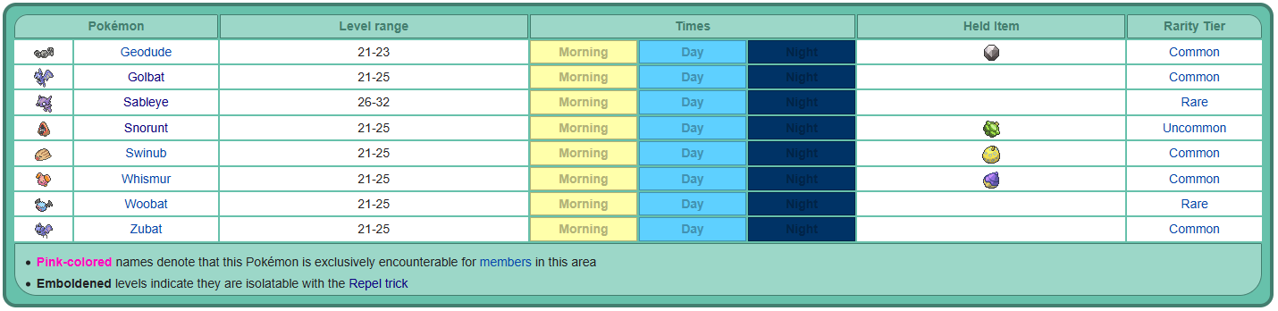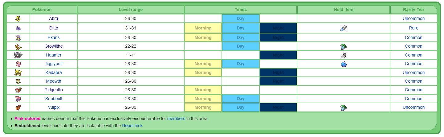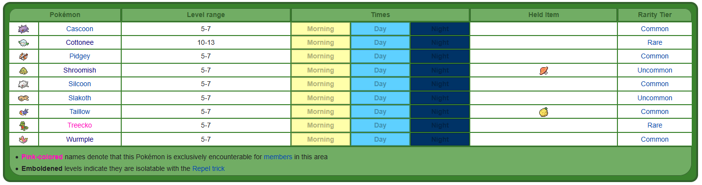 The Repel Trick Guide v2.0 Often in chat you'll have players discussing the best locations and methods to hunt their desired Pokémon, which can often involve repelling. Newer players can be unfamiliar with this process, and will ask how its done. This guide offers a full explanation of repelling Pokémon. A basic understanding of Repels The basic function of repelling in PRO is to repel away Pokémon that are at a lower level than your lead slot Pokémon. When traveling on a route with wild Pokémon, these Pokémon can be found within a certain range of levels. When using a repel item, your character can travel a given number of steps without encountering any wild Pokémon, so long as the Pokémon in your lead slot is at a higher level than the Pokémon that spawn there. This can be quite beneficial when traveling through routes where a player is unable to avoid tiles that can trigger a Pokémon spawn. While players can often avoid wild Pokémon by not walking in the grass, some locations like caves or water pathways, don't offer such an option. However, properly using a repel in those situations can allow the player to safely pass through without an encounter. There are 3 types available to players - Repel, Super Repel, and Max Repel. The difference between these repels are the amount of steps for each repel, as well as the costs for each repel. You can purchase repels from most Poke Marts, as well as all Department Stores. Cost to buy # of steps $ per step Repel 350 100 3.5 Super Repel 500 200 2.5 Max Repel 700 250 2.8 As you can see above, while your basic Repel is the cheapest to purchase, you're spending 3.5 coins per step of repelling. A Super Repel doubles the amount of steps without doubling the price for a single unit, offering your best "bang for your buck". The Max Repel is a bit more expensive than the Super Repel, both in terms of individual cost and cost per step, but it has the benefit of being the most time efficient, allowing you to walk longer and further before the repel runs out. That said, you can purchase Max Repel in bulk from the NPC Bonny, located in every department store. The benefit of purchasing in bulk is the discounted price, bringing the price per step down to match Super repel. Cost to buy # of Repels Price per step Max Repel 250,000 400 2.5 Repel hunting In some cases, there may be a Pokémon that spawns at a higher level than the rest of the Pokémon on a certain route. For example, Source Pro Wiki This is the list of Pokémon that spawn in the Petalburg Woods. Notice how Cottonee can be found at Levels 10-13, while the rest of the Pokémon can only be found at levels 5-7. This means that repelling with a Pokémon at a level of at least 14 will be able to avoid all the Pokémon at this location, but if you repel with a Pokémon at the levels 8-13, then you will only encounter Cottonee, and not any of the other Pokémon. This is especially helpful if you wish to hunt that specific Pokémon - you can repel away all the undesirable Pokémon, and only encounter Cottonee. This process is whats known as the Repel Trick. Because there is a gap between the levels that Cottonee spawns at and the levels of the rest of the Pokémon in this location, we have a buffer. Because Cottonee spawns starting at level 10, we can use a Pokémon at levels 8, 9, or 10 to repel away the undesired Pokémon, and only encounter the Cottonee. This buffer is nice because if gives us more options when it comes to choosing the Pokemon you wish to use to repel. We also need to be aware to not use a Pokémon at a higher level that could repel away some Cottonee. If you try using a level 12 Pokémon, then you'll only encounter Cottonee at levels 12 and 13, missing out on Cottonee spawning at levels 10 and 11. Here's an example where we dont have a buffer, so we need to get the exact level to properly repel hunt. As you can see, Ditto is the only Pokémon that spawns above the level 30, and at the same time, only spawns at 1 level, 31. This means you will have to run a level 31 Pokémon as your repel. Any lower, you'll spawn all the other Pokémon. Any higher, you'll get no encounters until your repel steps are used up. It should be noted, repel hunting doesn't mean you're going to start encountering a lot of whatever you're hunting. It removes the Pokémon you could normally encounter instead of your target Pokémon, but it doesn't increase the spawns of your target Pokémon. The spawn rates remain the same, the only difference is you are no longer being distracted by other potential encounters that could delay you finding your target Pokémon. You may still find yourself with lengthy gaps between encounters. Important Pokémon for Repel Hunting Lets take a look at Pokémon you'll be using to make your hunt much more efficient The Repel Pokémon - A bit obvious, but essential for the repel trick to work. The repel Pokémon is the lead Pokémon in your party which needs to be at the correct level to repel away the undesired Pokémon. If its not at the correct level, you will encounter the Pokémon you dont wish to find (too low of a repel level), or no Pokémon encounters at all (repel level too high). This Pokémon must be in slot 1 of your party. The Sync Pokémon - This is a Pokémon that has the ability Synchronize, and is commonly referred to as a Sync. A Pokémon with synchronize has a 50% chance of applying its nature onto a wild Pokémon. This is extremely helpful if you're hunting a Pokémon with a specific nature, like a Gastly that with a Timid nature. By running a sync Pokémon, you drastically increase the odds of finding a Pokémon with the same nature as your sync. When you're repelling, you can either run your Sync in slot 2 (alive, behind the fainted repel Pokémon in slot 1), or if its also your repel Pokémon, in slot 1 (alive or fainted). The False Swipe Pokémon - This is the Pokémon you use to catch everything with. Its most important feature is the move false swip