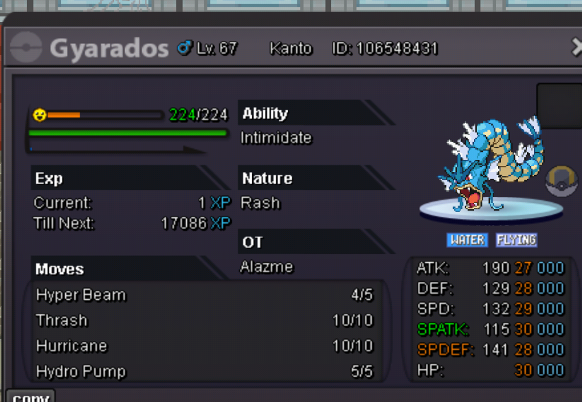 [AUCTION] Gyarados — Intimidate / Rash / Near-Godly IVs IVs: HP 30 | Atk 27 | Def 28 | SpAtk 30 | SpDef 28 | Spd 29 Start: 300k Min Raise: 100k Duration: 48h after first valid offer Server: Silver CC = 500k each IGN: Alazme
