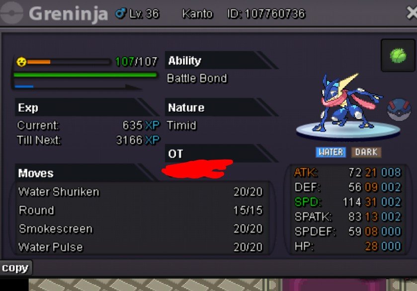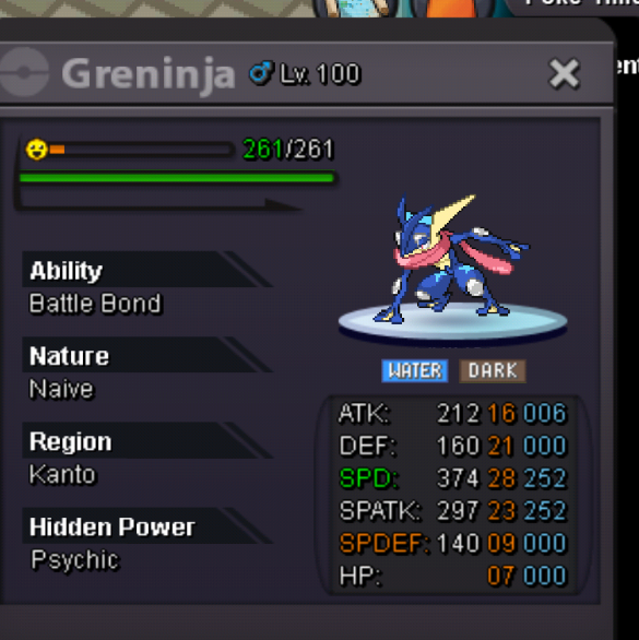 [Auction] Greninja — Battle Bond Nature: Naive Ability: Battle Bond Hidden Power: Psychic Region: Kanto Level: 100 IVs: HP 07 | ATK 16 | DEF 21 | SPD 28 | SPATK 23 | SPDEF 09 Start Offer: 1.5m Min Raise: 300k Duration: 48h after first bid Accepted: Pokédollars / CC = 500k Cross-server: Silver + Gold