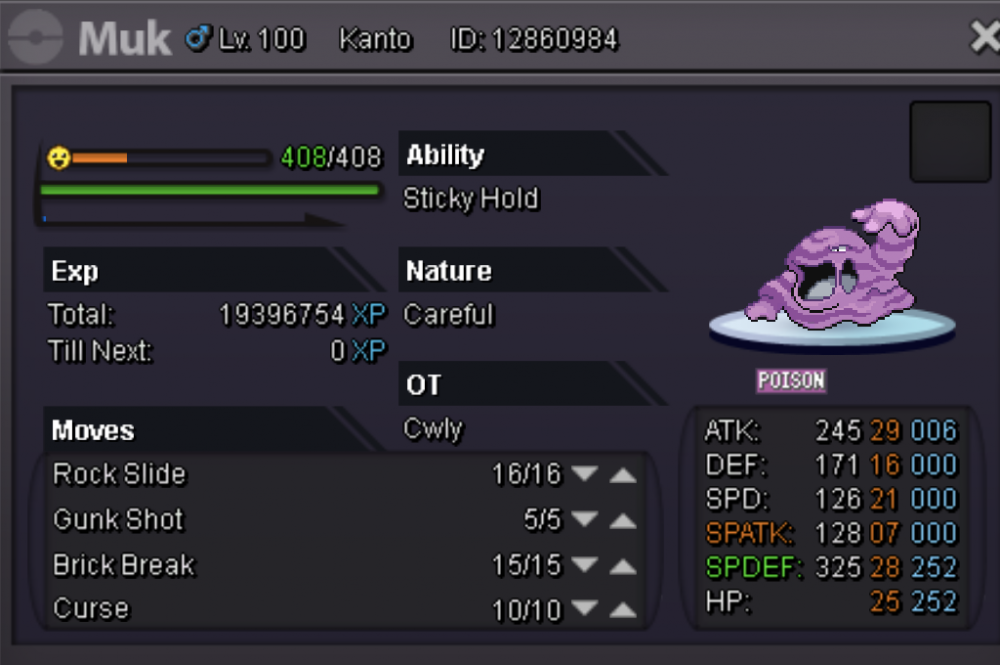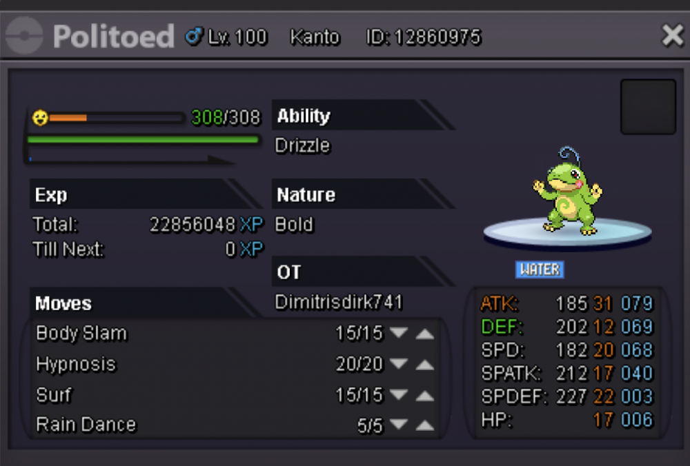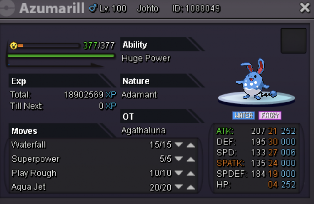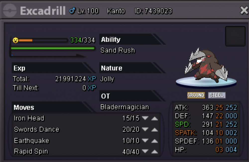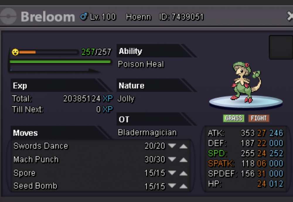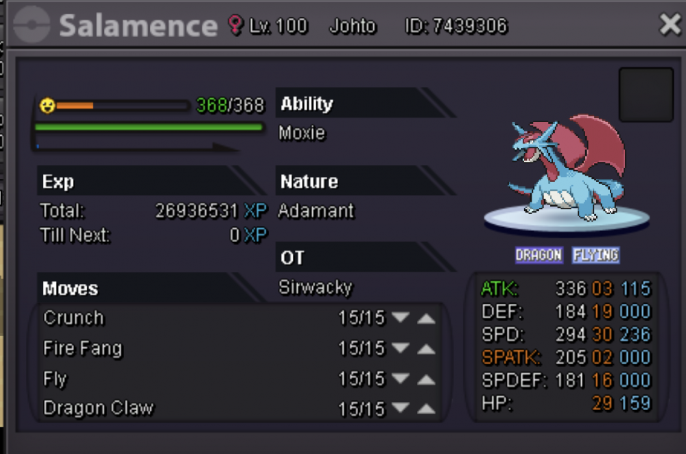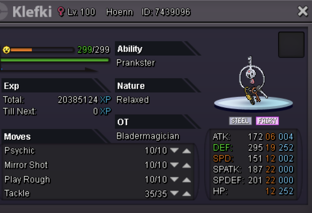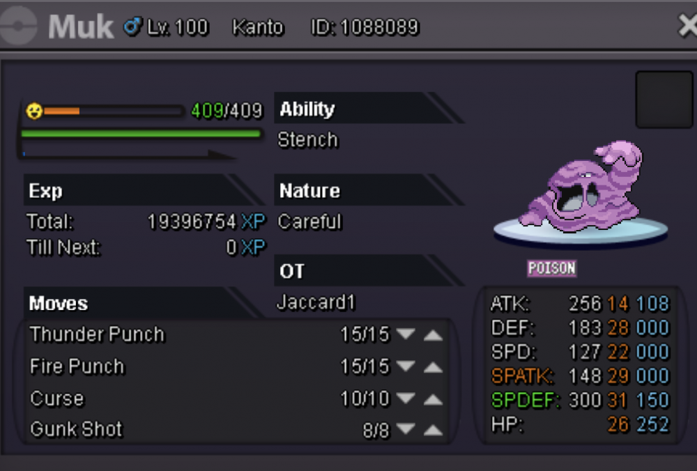 9. HEY CUTIE WELCOME TO MY SHOP [spoiler=My Discord Information]My Discord is djburke47#3882. [spoiler=Rules-READ FIRST] [spoiler=Rules-READ FIRST] [spoiler=Rules-READ FIRST] All prices are negotiable. All listings are in alphabetical order!!!!!!!!! I take reroll tickets as 550k and nature reroll as 275k. I take Coin capsules as 250k and BMS as 140k. I take RC as 5k and focus sash as 1k each. Please be respectful, I will trade for other pokes but I am not looking for them. I prefer money. I used to be staff and will make sure if you fake bid you will get banned. Stay Respectful. All the pokemon thumbnails have prices in their name. Hover mouse over the picture to see the price. I have the right to deny an offer, stop a trade or ban a player from shopping here with no notice. Trade is not locked in until it actually happens. If another user meets me before you, they get the pokemon. Customer must travel to me to pick up pokemon. No pokemon will come with item and they will be sold as is. In your offer please post a screen shot of what pokemon it is exactly or include distinct feature like 3 iv values I am in school, I will try my best to keep up but stay patient. POST BOTH HERE AND IN DISCORD IF YOU ARE GOING TO PM ME THERE. Shinies and event mons can be found here ----> Shinies and Event Mons CHAOS MEMBERS ONLY DISCOUNT ----> 100k off for every 600k spent in form of a credit (If you spend 600 you can get a free mon less than 100k, 1.2m get a free 200k mon, 1.8 mil 300k mon, 2.4m 400k mon) Enjoy! [spoiler=Pokemon For Sale][spoiler=A-C] [spoiler=D-F] [spoiler=G-I] [spoiler=J-L] [spoiler=M-O] [spoiler=P-S] [spoiler=T-V] [spoiler=W-Z] [spoiler=Sold Pokemon] [spoiler=My WIshlist] Charmander-Timid/Jolly Sableye-Impish/Careful HA Mudkip-Adament Medicham-Jolly Pure Power Ferrothorn-Sassy Excadrill-Jolly HA Garchomp-Jolly/Naive HA
