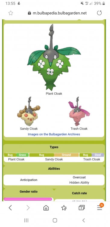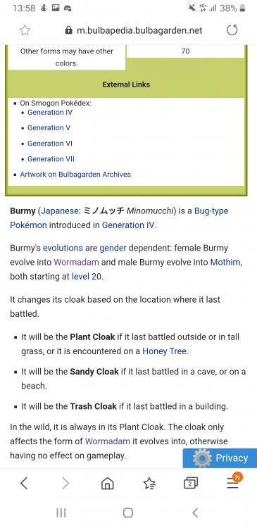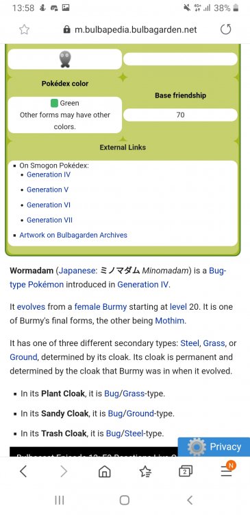 Hello, supertrainers. First of all, Wordamam has three formes, each having a different type. One is Bug/Ground, another one is Bug/Grass and the last one is Bug/Steel. She evolves from Burmy, whose form changes upon fighting in a Building (Steel), Cave/Beach (Ground) or Tall Grass (Grass). She does not gain the typing until Burmy evolves, though. Please, check it correctly in any wiki such as bulbapedia before answering. His issue is related to him having his Burmy fight in a building, where it should've changed into the Steel cloak, and then evolved into the correct Wordamam form. Secondly, please be careful if you tag @ here in forums. This does not work like discord where you tag everyone who is online in a server. In forums, you tag the person whose ingame username is literally named Here. :) I'll add the pictures of the wiki, to clarify until a Staff member resolves it.