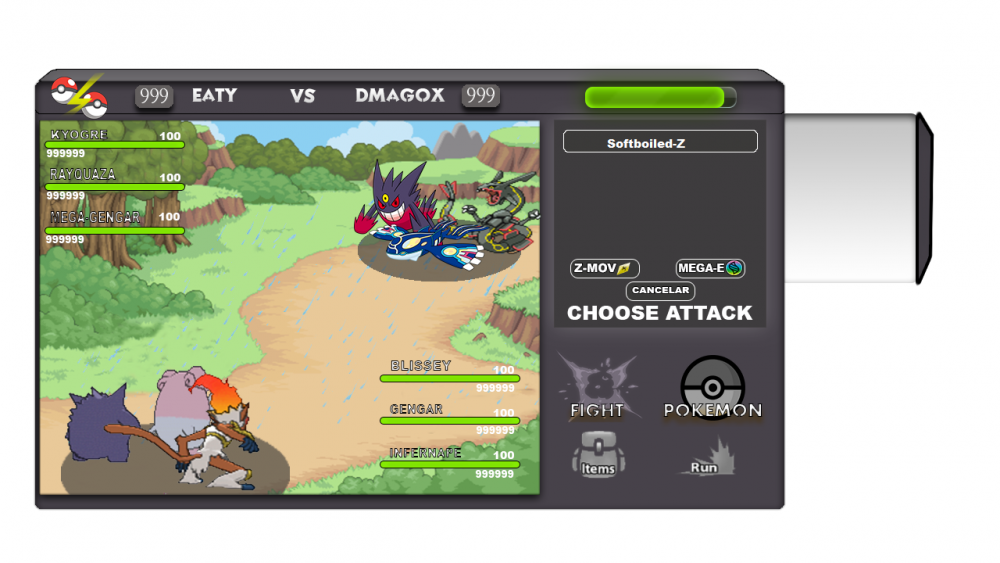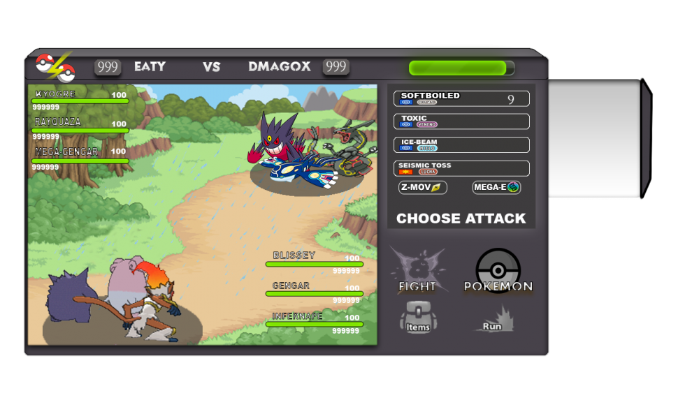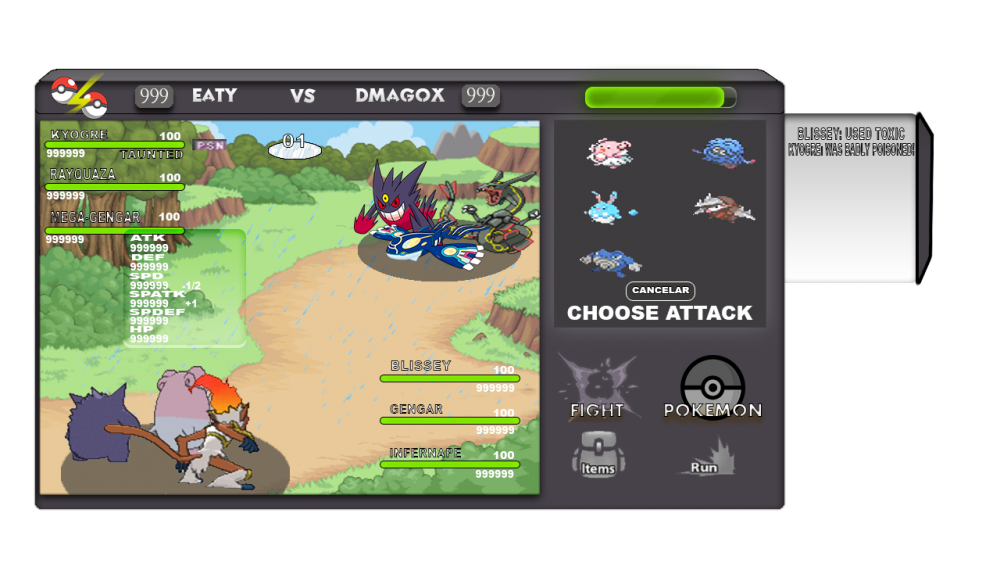 1. Good morning, friends of Pokemon Revolution. I will show you my designs of battles 2vs2 and 3v3 the next interface is based on almost the original only that my tastes, I hope you like enjoy the images and thanks for watching them <3 Information: I worked on the opposite in the following way. first: in image 1 and image 2 as you can see they have those numbers 99999 design that in such a way you can see the hp of the pokemon that are in battles Second: the movements, by clicking on the fight button shows you the movements that have said pokemon and also the z-mov and the mega-evolution option, by pressing a movement you can choose if you want to cancel or not the movement that has been selected, as seen in image 3 and image 4. third: the climates in battles, and designed a small icon that shows the climate that is used in battle and the number of turn that has that climate, as can be seen in image 5 fourth: that box shown in picture 6 shows the stats of the poke and debuff, in picture 7 you can see the effects of battles such as taunted or paralized, toxic etc. fifth: in terms of item and pokemon I like the current designs so I only added the cancel button in case you do not want to choose it or pokemon sixth: that bar that can be seen in the images almost transparent that is the option to register battles there will be displayed all the movements used in battles, that bar is removable can be expanded and contracted by clicking note: the uir button leaves it the same I did not see it necessary to change it, there is also an icon that shows the ranked points of each user as well as their name that's all that was in my reach I hope you enjoy it and thank you image 1[spoiler=more] image 2 image 3 image 4 image 5 image 6 image 7 image 8 image 9