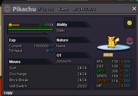 II. Contact Ingame: Ryokaiser12 Forum: In this thead or PM me Discord: kaiserdyer18 ____________________ WANT TO BUY: Venusaur HP Fire Modest Chlorophyll 31 speed/high speed + good ivs Excadrill - Adamant 31 Speed (Sand Rush ability) Espeon/Eevee - Timid 31 Speed HP Fighting/Fire/Ice/Electric (Magic Bounce Ability) 1.000.000 Multiscale H.A Adamant Dragonite 31 speed 900.000 Solar Power H.A Modest Charizard HP ICE (suitable for choice scarf) 2.500.000 Goldly Timid Pikachu HP Dragon 31 31 29 31 31 300.000 Jolly Mega Charizard X 31 speed 1.800.000 Bulletproof Naive Kommo-o 31 ATK 500.000 Electrike / Manetric H.A 31 speed HP Grass 1.000.000 Bold Togekiss 31 speed 400.000 Timid Togekiss 350.000 Ferrothorn Sassy 2.500.000 VENUSAUR H.A ICE 1.000.000 Hasty Hydreigon HP ICE 800.000 SHINY H.A Modest Exeggutor HP FIRE (Good for Trickroom Team) 500.000 Goomy Goodra 31 Speed 1.000.000 Absol 31 Speed 500.000 Impish Gyarados 30 30 650.000 Jolly Gyarados 31 31 1.000.000 H.A Bold HAPPINY CHANSY BLISSEY 31 31 31 500.000 Bold Blastoise HP. FIRE 500.000 Adamant Breloom 31 speed 400.000 Careful Cofagrigus 31 speed 700.000 Adamant Excadrill 31 speed 400.000 Timid Alakazam 31 speed 400.000 Simisear 1.000.000đ GOLDUCK H.A HP FIRE (For rain team) 800.000 Whimsicott Timid 31 Speed 600.000 Sassy Ferrothorn 500.000 Naive Pikachu with Lightball 300.000 Infernape HP ROCK 350.000 Jolteon HP Fire Volt Absorb 600.000 Adamant Breloom 31 speed 800.000 H.A Rash Venusaur HP Bug 600.000 H.A Modest Venusaur HP. Ground 1.500.000 Adamant Scizor 31 ATK 200.000 Chansey +SP.DEF for bosses 600.000 BOLD Chansey 31 speed 500.000 BOLD Blissey