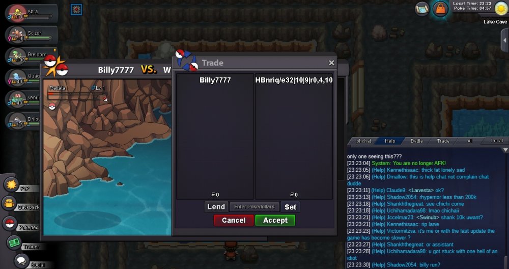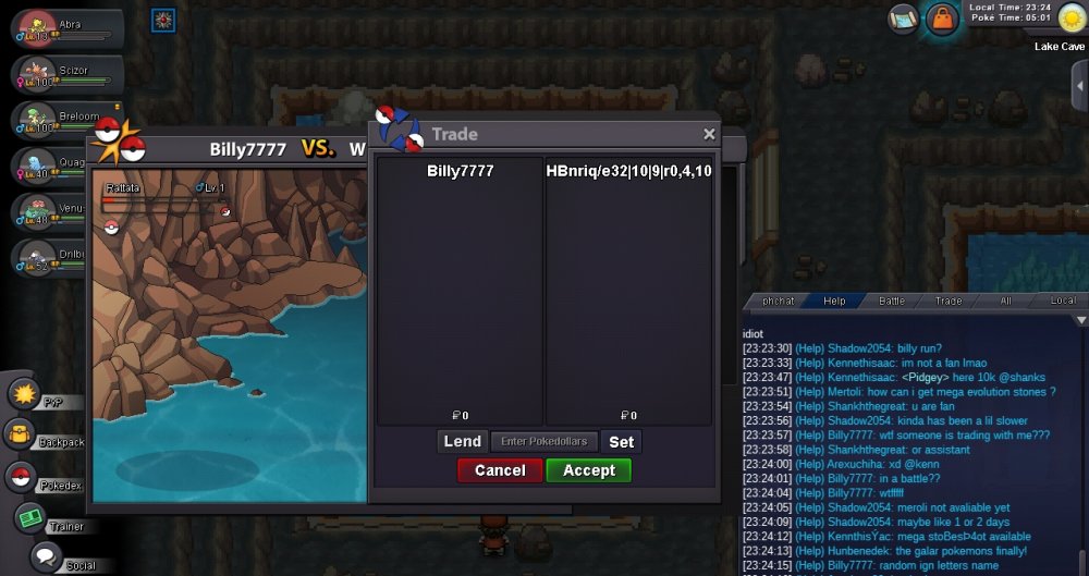 Greetings! Heres some context behind the pictures, I was hunting some froakies in lake cave via surf when suddenly I encountered a level 1 rattata. Totally had me confused but decided to try and catch it, so false swipe via Scizor then he dissappeared. Then random letters and symbols started appearing on chat and finally I got into a trade with a random dude with random symbols and letters. Hope this gets fixed.