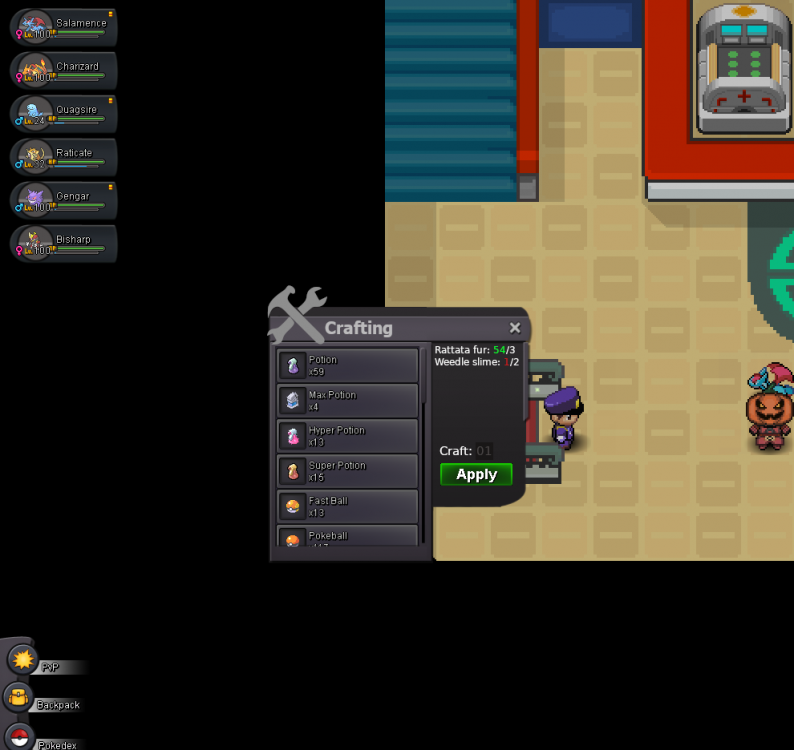 Hello, Just short before I begin explaining, please avoid comments like "This is not minecraft", because I am more than aware that it is not. I was thinking about something that could make PRO better in the long term, occupy players for longer periods and always give them some sort of perhaps, daily goal? I know the devs are in a rush now and working on many things, so this could work as some sort of an idea for the future ;). So let me start, PRO lacks some sort of activity that players could do and benefit from aside from usual pokemon farming and endgame boss fighting I am not counting Officer Jenny, since her quests are one time only and not really worth it. New players can usually only catch pokemon while on their journey to complete the story and can't do bosses. In the long run, players can get bored from hunting pokemon all the time or when they catch the pokemon they want, they could succumb to "burnouts" or loss of motivation from a lack of a goal. This leading to loss of playercount. Pokemon is a game with infinite replayability, indeed. But there will come a time when people get tired from always hunting hours for that epic h.a. tier 8 pokemon. So I thought about what do people do while trying to catch pokemon or do bosses? They travel, they travel in grass, encounter wild pokemon... and run from them. Runing from wild common pokemon because they have no use for them. What if we gave them a purpose? What if we encouraged people to hunt even more?! What if we could give players a permanent side goal they would continuously complete and maintain their motivation when they aren't able to catch that perfect pokemon? Here comes my idea, brace yourselves :D It is adding a crafting system, a new tab, that would allow players to utilize random wild encounters to craft common items up to better ones? Sounds pretty wild, doesnt it? Lemme explain: -I suggest that we could add material drops that you would recieve from any pokemon encounter when you kill/catch it What I mean by that is, that every pokemon would drop its unique material after you would defeat or catch it. The higher the pokemon tier, the higher the material rarity. This could transform annoying wild encounter while traveling, into juicy re-stocking opportunities. Example: 1 Rattata drops 1 Rattata fur after battle -I suggest that we would be able to craft different items from these materials like potions or pokeballs! Not every player wants to spend his money on buying basic, one use items. Instead, crafting and gaining materials while normaly playing the game would reward the more active and devoted players that already invested thousands of hours into the game, by giving the opportunity to utilize all the efforts they've invested into the game by essentialy, "removing the money cost of base items" if they have enought resources. This could also help new players while on their journey when money is not around. Example: PRO players wouldnt need to spend crazy amounts of money on repels when they would be able to craft them! -Insane opportunities for better in-game events and for the player's motivation! The crafting system could have infinite ways it could be used! We could craft through it event exclusive items instead of having to catch tier 8 pokemon and gaining "coins" to buy items in the shop (I am looking at you, recent Halloween event), acquire crafting recipes through in-game events that would or would not disappear after the event, to get the possibility to make yourself event clothes for example. Players that dont intend to hunt hours for pokemon or arent interested would also have something to chase after they completed the main event quest. -I suggest adding various recipes to obtain as all kinds of rewards. Recipes can be used in many places as exclusive ways of gaining rewards. Example: When an event begins, all players would gain a limited time recipe for event items for them to craft. Recipes for exclusive clothes from defeating a PVE boss. PVP random or shop purchases. Rewards from quests. -I suggest the crafting system itself :P. The crafting system would be a tab just like the inventory, pokedex, etc... You would be able to access it anytime and craft anything you currently need. You would be able to view the amount of each material you have in a new tab in the inventory. The crafting tab would be a place where you could view all the available items to craft. You would select one by clicking at it, viewing the required amount of each material, being able to write manualy the amount of the crafted items, and being able to craft it! Example: We could also add a little "info" icon next to each material to get an indication on where to find it. -I mini-suggest :D This could also be a future way of obtaining/making mega stones (maybe Z-stones too...) You could perhaps obtain the recipe for making each individual mega stone from its own quest and once unlocked, you could maybe craft it for a high material price of course. I have the feeling, that I listed the majority of the positive effects it could bring, now, to the negative part: -Making possible to craft clothes could slightly break the economy, only if the clothes would be made tradable. -A crap ton of work for the small PRO dev team. (That's why I listed this only as a side idea for when the major issues were being done dealing with) Bottomline, I think this would be an increadible and very unique way of giving the players a chance of getting something extra out of their normal playtime and I think it still has a lot more potential than I said in this suggestion post. Thank you so much for reading my whole post ;) Filda.