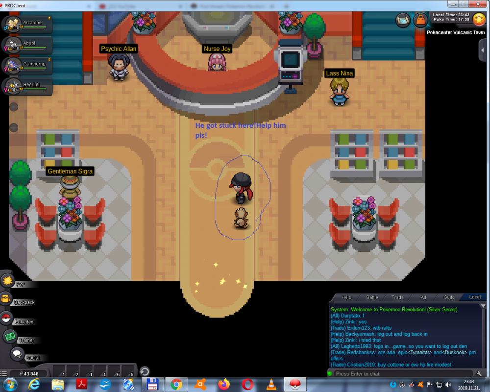 so his character name: alkimista28. Pls he my friend!And can you dear admins teleport his character to Fuchsia city!