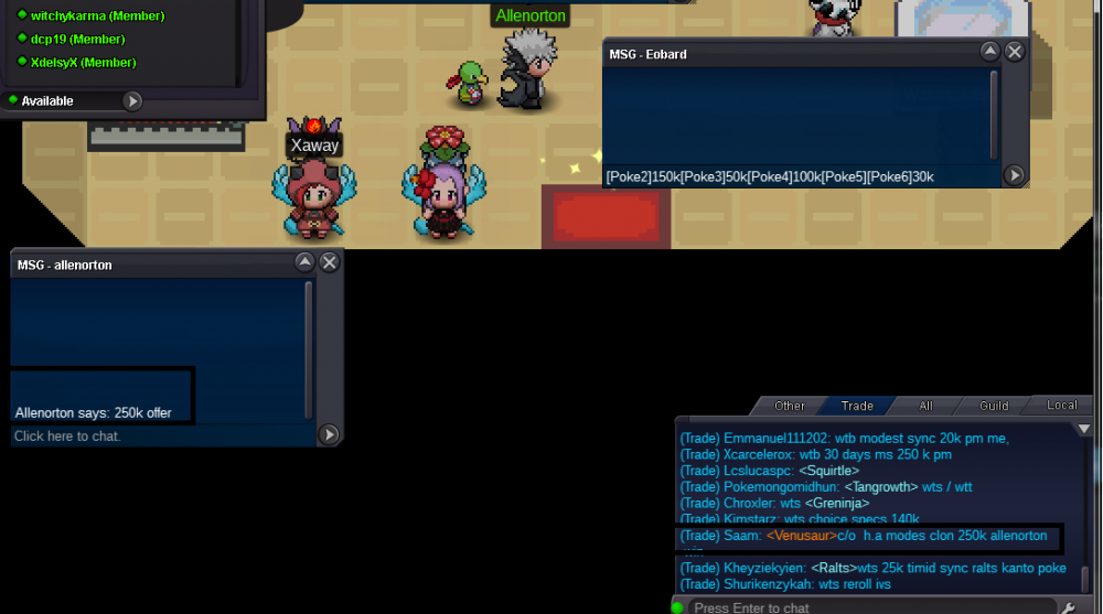 This is my Loan Shop (Rent)(Lending) POKEMON in PRO n-n I hope you like I changed the name of Tonabi to Saam c(= Info: * 50 for 5 days * 250k 30 days * Below I will say what I sell * I hope this seems fair to them * if something is misspelled it is for the translator * Discord : ! Saam#9572 * Discord of mi guild https://discord.gg/BmPV9US * These are the ones that I sell Togekiss normal Goodra Charizard Kingdra Roserade Snorlax adaman Tyranitar adaman Magmorta Metagros Pokemon List OT Saam * A b s o l * * A l a k a z a m * * F l o r g e s * * F r o s l a s s * * G l i s c o r * * G o l e m * * G o o d r a * * G y a r a d o s * * L e a f e o n * * M a m o s w i n e * * M i l t a n k * * C i n c c i n o * * N i d o q u e e n * * P o l i t o e d * * S l o w b r o * * A l a k a z a m * * T o g e k i s s * * T y r a n i t a r * * W e a v i l e * * C l o y s t e r * Shinys Pokemon * C l e f a b l e * * G r a n b u l l * * T a n g r o w t h * * T o g e k i s s * * V i c t r e e b e l * Other OT * A c c e l g o r * * A r c a n i n e * * B e a r t i c * * C h a n d e l u r e * * C h r i z a r d * * C h e s n a u g h t * * C r a w d a u n t * * D r a p i o n * * H a x o r u s * * D u s c l o p s * * E s p e o n * * G a r c h o m p * * G a r d e v o i r * * G e n g a r * * K a b u t o p s * * K i n g d r a * * L a n t u r n * * L o p u n n y * * L u d i c o l o * * M a c h a m p * * M a g m o r t a r * * M e t a g r o s * * M i e n s h a o * * M i l o t i c * * M i s m a g i u s * * N i d o k i n g * * N i n e t a l e s * * R o s e r a d e * * P o r y g o n - Z * * S a w k * * S c i z o r * * S e i s m i t o a d * * S h i f t r y * * S h u c k l e * * S k a r m o r y* * S n o r l a x * * S n o r l a x * * T a l o n f l a m e * * T e n t a c r u e l * * T y r a n i t a r * * V a p o r e o n * * V o l c a r o n a * * W e e z i n g * * W h i m s i c o t t * * Z a n g o o s e *