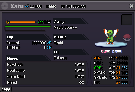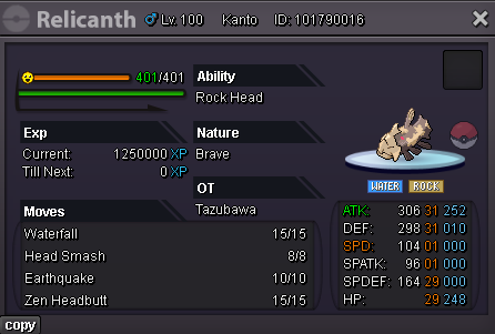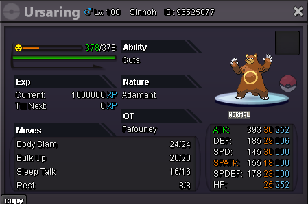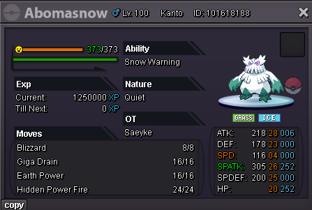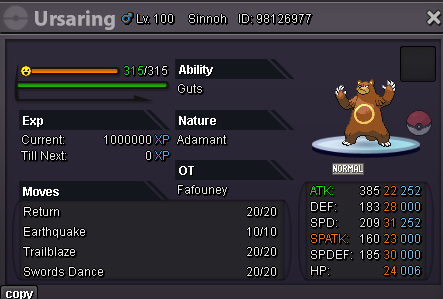 Bump Added: - +22 31 Spd Adamant Ursaring - +23 Adamant Ursaring - +25 31 Spd Adamant Ursaluna - +26 Adamant Ursaluna - +25 01 Spd Brave Ursaluna - +25 Impish H.A Dragonite - +23 31 Spd Timid Blacephalon - +29 01 Spd Brave Relicanth for the memes - +22 31 Spd Timid Hydreigon - +22 31 Spd Adamant Goodra - +27 31 31 Timid H.A Xatu - +22 28 Spd HP Fire Ribombee (they will never know you have Honey Gather trust!) - +22 31 Spd Adamant Sharpness Gallade - +23 04 Spd Sassy Aegislash - +20 04 Spd HP Fire Quiet Abomasnow - +22 31 Spd Timid Abomasnow Removed: - +21 Brave Ursaring Adjusted moveset of: - 28 Spd Sassy Aegislash - Quiet Aegislash - Alomomola - Adamant Swampert 343.