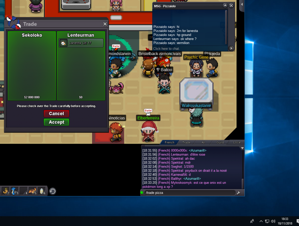 Adapt your moderation : a 'W' in trade chat is not a fault or an obligation to warn a player, someone speaking another language in another chat could have made a fail of tab, don't warn him. These are some kind of examples which could be better handled. It's not making an exception, it's adapting moderation to real cases. One player could have fail, 2 players in less than 5 minutes is probably an infraction. Judge everyone differently : If you warn and mute someone , please, only warn the second player. The 2nd player can just connect, or just switch chat, or re-open the chatbox ( i kept it closed when i farm ) and has never seen the warn. Adapt your sanctions : When someone is muted for swearing, stop over-cumulating the sanction until banning him. No provocation on mod, adapt duration and don't sanction on the next duration stage. If weeks between sanctions , maybe reset or just pass on previous duration stage. Be more precise : When you moderate, precise more the message of the sanction. Some players are sanctionned with one word as reason and really don't understand why they are muted. You forced them to make an appeal. Find a way when players dc/crash and don't have the name of the buyer/seller. We could only find the buyer/seller in Trade chat as they keep this chat open. So asking ' Hey the man who sells Charizard, pm me ' is the best way to find again the guy. They surely don't have All Chat or Another chat open at this moment. Don't moderate this case until a proper way is find. There was a specific case : Lot of french players got sanctionned from the French channel because of their behavior. We decided to create a private channel and invited all the guys who wanted to speak freely. We couldn't speak freely because : Couldn't force a password (desactivated) The mod (Epiales) was aware of the channel because some players enforced the rules and advertised the channel on French channel => Give again the option of password for the private channels plz Over the 3 years of PRO, lot of players left PRO because of the extrem application of the rules and the no-adaptation to each case and each people. Professionalism is different of being strict. Thanks for having read my post.