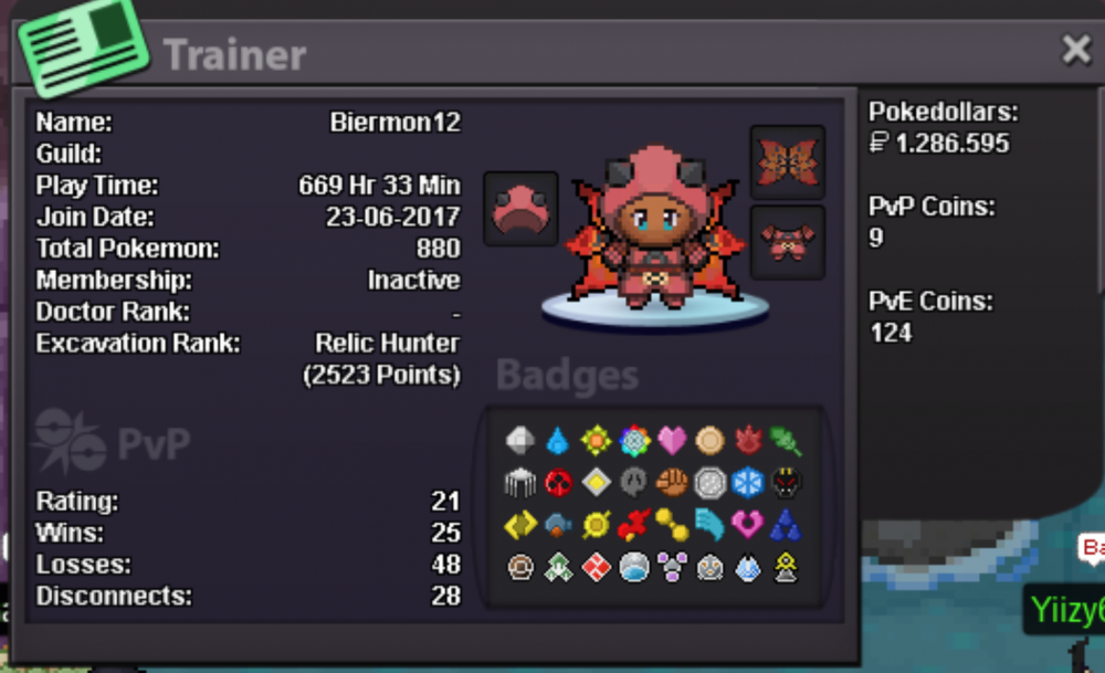 Why do you want to join NoMercy? 1.Because a friend recommended it to me :) And I want help building my epic pvp team. What can you contribute to NoMercy? 2.I could help hunt Pokemon that other guildmembers want. I also like to think about solution for other members and there pvp team. Have you ever been banned in PRO, and why? 3.Yes, but it was something that looked suspicious (so it lasted for a few days). It was rmt plus mass account. Other than having fun playing the game, what are your goals in PRO? 4.I like to collect epic non meta pokemon. Like in every game i hate the meta so i want to play with pokemon that other players dont play with. Like im trying to find a good team with fossil pokemon right now. Aurorus is the pokemon i want to make work. How old are you and other than English, what languages do you speak? 5. Im 20 years old. I dont speak English very well but i try every day to learn to be better at it. I also speak dutch. What is your discord name and ID tag number? (Example: teerav#0975) biermon12 #4279 Provide a screenshot of your Trainer Card.