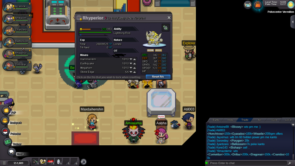I saw your post in the shiny forum, they are lvl 100 poke full trained. Then Rhyperior and ambipom are not even first gen poke and i already have growlithe / arcanine... So i'm not interested. I would have paid well for the rhyhorn shiny untrained but it's too late now :Crazy: i have shiny rhyhorn now