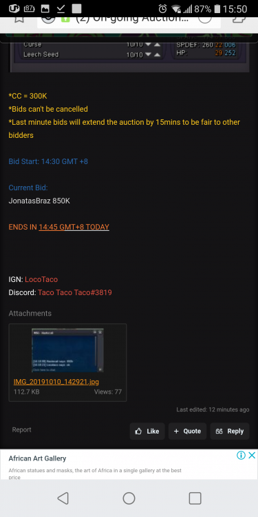 Nayeonblue Posted October 12, 2019 Share Posted October 12, 2019 The auction was supposed to end at 14:30 GMT+8 you extended it by 15 minutes so my bid, which came before 14:45, was not belated. You never specified that the 15 minutes was counted from the moment somebody makes an offer. Link to comment https://pokemonrevolution.net/forum/topic/137457-on-going-auction-epic-relaxed-ferrothorn-low-speed-sold/page/2/#findComment-755448 Share on other sites More sharing options...