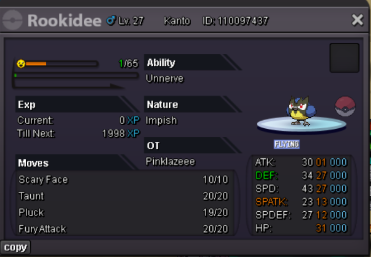 pinklazeee Posted November 2, 2021 Share Posted November 2, 2021 (edited) Accepted Payment Methods pokedollar coin capsule - 480k rerrol ticket - 700k Contact Information Discord - pinklazeee In-game- pinklazee - pinklazeee Rules Spoiler 1.Leave a contact when buying/offering (Discord, Ingame name). All the trades will be done in vermilion pokecenter, incase the buyer is not able to travel then i will travel to your location given that i have an active train ticket. 2. Fake offers will be reported. 3. Prices are not fixed and can be negotiated. 4. If you are from Silver server, you need to transfer to Gold Server in-order to buy/collect your pokemon(s) or add 2cc for me to transfer, or you could mention your alternative while placing your offer. 5. If any items are shown in the picture then they are not included in the trade or are not for sale. 6. Trade will be done from my alt - pinklazee Discord Spoiler Untrained Pokemons Spoiler Tinkatink Spoiler 50k 50k 50k 50k 50k Rookidee Spoiler 50k 120k 600k 120k 150k 85k 85k 150k 250k 450k 100k 60k 50k 60k 200k 200k 50k 85k 60k 65k 150k 280k 500k Hatenna Spoiler 150k 85k 95k 90k Cottonee Spoiler 200k 85k 65k 85k 160k 90k 250k 65k 250k 100k 65k 50k Ferroseed Spoiler 100k 120k 160k 200k 250k 90k 100k 110k 145k 180k 200k 450k 150k 90k 50k 100k 300k 100k 100k 190k 200k Pancham Spoiler BOSSABLE +atk & good ivs 180k Charmander Spoiler 50k 65k 70k 80k 50k 100k 150k 120k 70k 90k 200k Honedge Spoiler 150k 2m ( 22+ ivs ) 100k 150k Larvitar Spoiler 75k 100k 200k 75k 50k 50k Mimikyu Spoiler 500k 200k 120k 180k 300k 290k 190k Cyndaquil Spoiler 2.5m 100k 300k 200k 400k 100k 90k 85k 85k 100k 90k 100k 90k 1m Piplup Spoiler 1.5m 600k 1m 400k 100k 200k 150k Gible Spoiler 600k 50k 75k 75k 50k 100k Oshawott Spoiler 2m Reverse Godly <9 ivs : 200k 75k Scyther Spoiler 300k 300k 75k 50k 50k 900k 100k 150k 75k 150k 50k 50k 50k 150k 120k 110k 100k Fennekin Spoiler 400k 100k 500k 75k 300k 350k 250k Fletchling Spoiler 2m 1.5m 2m 300k 50k 500k 650k 1.2m Cutiefly Spoiler 400k 250k Blacephalon Spoiler 300k 100k 300k 100k 200k 50k 100k 100k Pawniard Spoiler 100k 70k 150k 190k 80k 600k 70k 100k 60k 100k 200k 90k 60k 100k 70k 60k 100k 70k 90k 100k 120k 150k 65k 50k 50k 50k 50k Alolan-Grimer Spoiler 150k 50k 100k Munchlax Spoiler 300k 500k Zorua Spoiler 50k 100k 100k Petilil Spoiler 1m 100k 100k Rattata ( Summer Form ) Spoiler Reverse Godly < 6 ivs : 150k 125k Jangmo-o Spoiler 100k 300k 100k 1m 200k 100k Snivy Spoiler 200k Eevee Spoiler 150k 120k 200k 180k Larvesta Spoiler 100k 200k Electrike Spoiler 100k 800k Edited 4 hours ago by pinklazeee 3 1 Link to comment https://pokemonrevolution.net/forum/topic/187630-lazeees-untrained-shop-update-2501/ Share on other sites More sharing options...