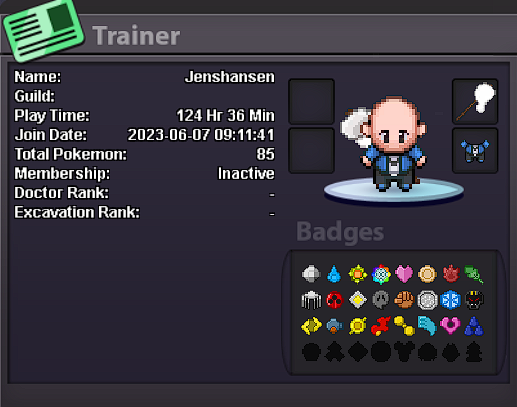 Jenshansen Posted July 11, 2023 Share Posted July 11, 2023 1. What's your Player name (IGN)? JensHansen 2. Country? Denmark 3. What's your favorite Pokemon? Rampardos, no doubt! 4. What do you enjoy doing the most in PRO? I enjoy most of what PRO offers, but mainly hunting pokemon! 5. Why do you want to join Psynergy To have a group of friends to talk to in a nice community! Which, would be a pleasure to become a part of 6. Highest PvP Rating ever? Dont really play PVP 7. Discord Tag? magnuus_/magnuus_#3494 8. Age? 22 9. Post a screenshott of your Trainer Card 1 Link to comment https://pokemonrevolution.net/forum/topic/212507-gold-server-nemesis-a-european-guild-recruiting/page/6/#findComment-1282031 Share on other sites More sharing options...