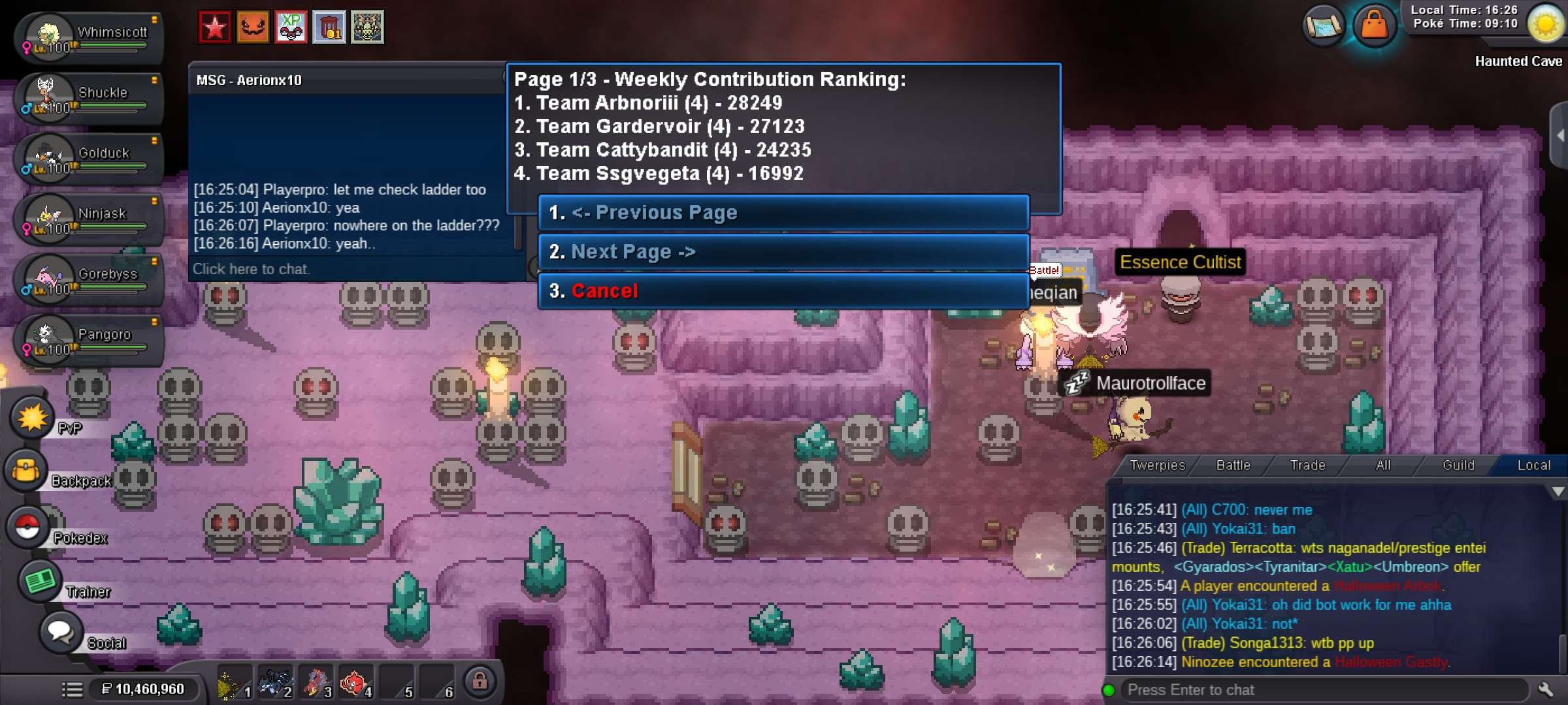 Aerionx10 Posted yesterday at 01:48 PM Share Posted yesterday at 01:48 PM Hello! I wonder if this is a bug but me and my team did this week's party WQ. It ended normally yesterday and we ended up scoring ~19k ivs. However, today, we can't see our party anywhere on the leaderboards. Also, the NPC is showing us to create/join a party again. According to the SS we are suppose to be at 4th. I don't really have SS of us making 19k but I'm pretty sure we did it. The attached images show our POV of leaderboards. First one is from my teammate and other one is my POV. Party information: Aerionx10 (Party Leader) Playerpro Tame849 Ayuzh 1 Link to comment https://pokemonrevolution.net/forum/topic/265650-halloween-party-wq-reset/ Share on other sites More sharing options...