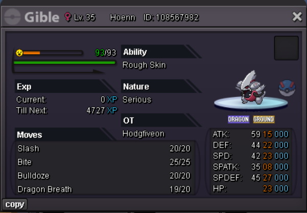 Suzu1 Posted 14 hours ago Share Posted 14 hours ago You can only reroll it using exclusive smr reroll though in this situation this certain gible is not worth to reroll nature. As they are very expensive rerolls costing roughly 50m+- . Better to sell in auction since it's new form and h.a I suggest starting off auction at s.o 1m and wait for the end. 1 My shop:https://pokemonrevolution.net/forum/topic/257691-pokémart/ Link to comment https://pokemonrevolution.net/forum/topic/266450-looking-for-an-appraisal-for-my-halloween-gible/#findComment-1641469 Share on other sites More sharing options...